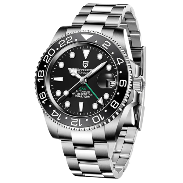 The Pagani Design PD-1662 is a sophisticated watch built for precision, durability, and style. Featuring a 40mm 316L surgical stainless steel case with a unidirectional ceramic bezel, this timepiece is designed for travelers who need dual time zone functionality. Its sapphire crystal with anti-reflective coating ensures clear visibility, while luminous markers provide excellent readability in the dark. Powered by an automatic movement with a rotor engraved with the Pagani Design emblem, the PD-1662 combines technical performance with timeless elegance. With a screw-down crown, 100-meter water resistance, and a solid stainless steel bracelet secured with a titanium-stainless steel clasp, it’s a versatile watch for both everyday wear and intercontinental adventures.